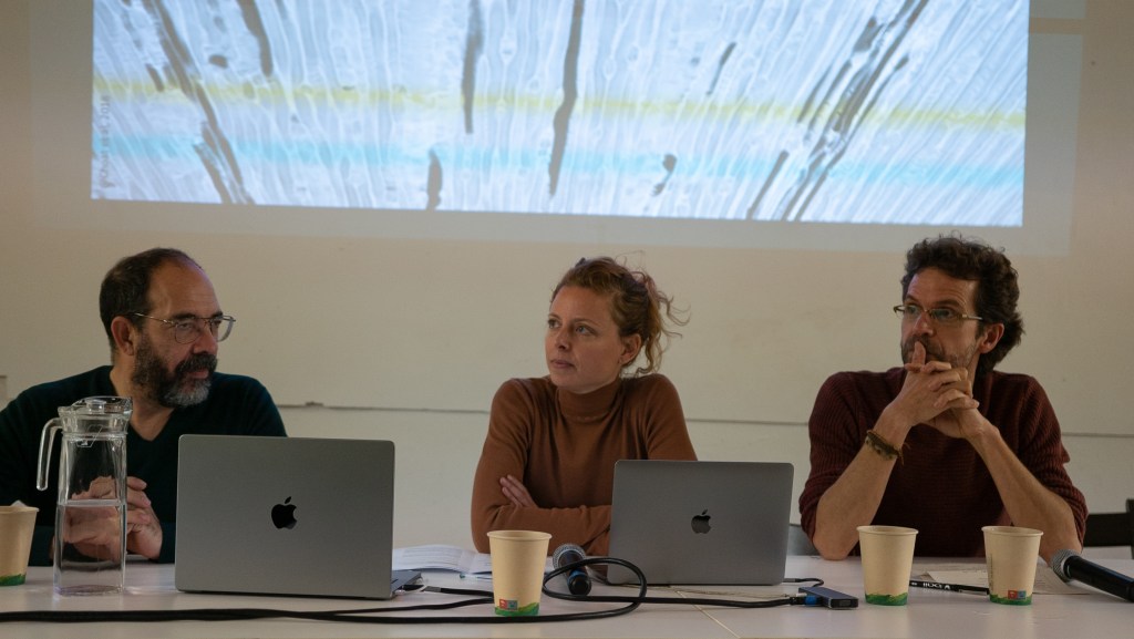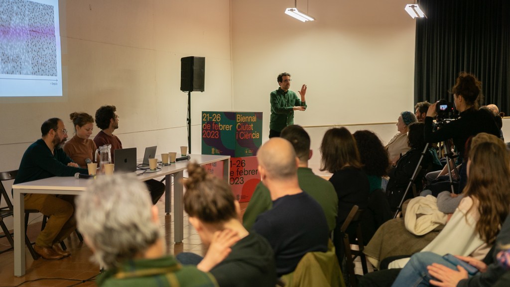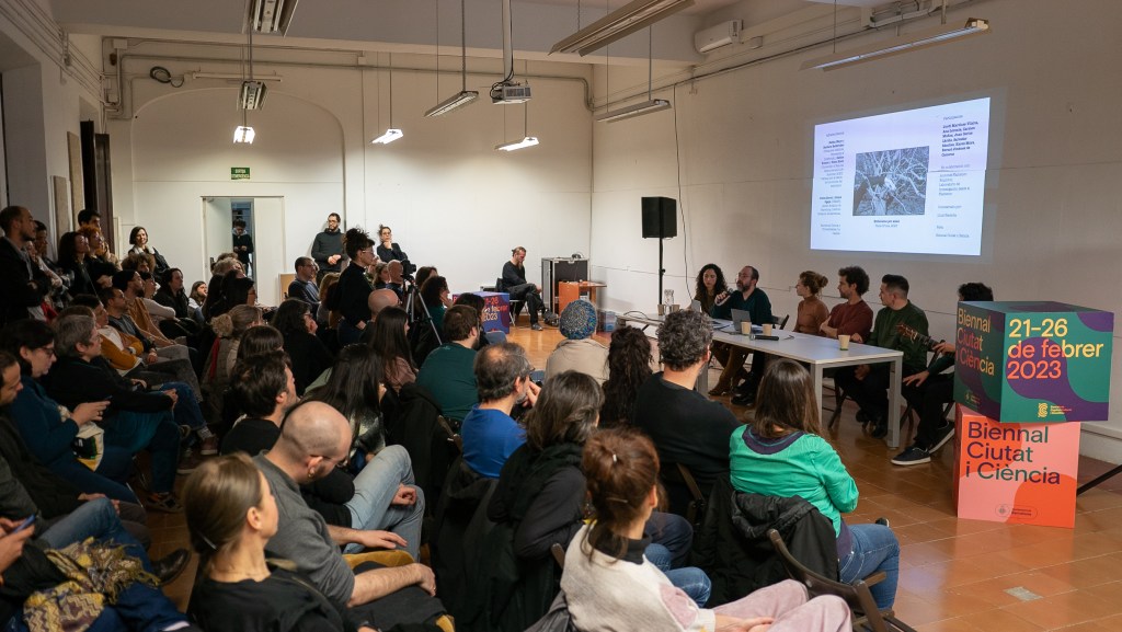 Imágenes del diálogo performativo en La Capella, en el marco de la Bienal Ciudad y Ciencia de Barcelona, 2023. Fotografías de Pau Araus Serret.